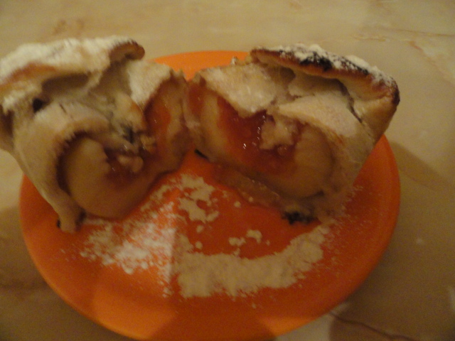 Apoi umplem interiorul marului cu gem si sambure de nuca.Cand aluatul este dospit il impartim in sase parti si fiecare parte se intinde in forma de cerc pe masa unsa cu ulei.Dupa ce s-a intins se presara cu zahar si scortisoara apoi se pune marul in mijloc si se imbraca in aluat.